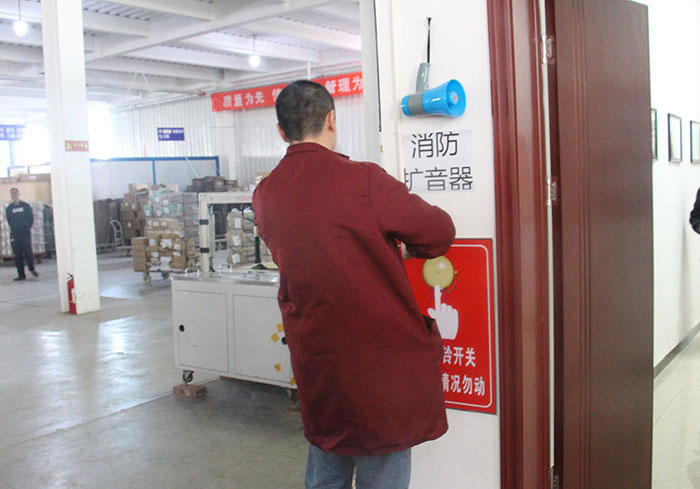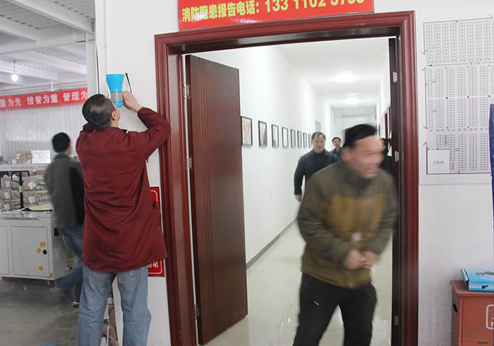 下午3:00,一陣急促的警報聲拉開了“消防安全疏散演練”活動的帷幕,聽到警報聲,正在作業的庫房人員以及辦公室人員第一時間跑出作業區,捂著鼻子、拱著腰,緊張、有序地迅速轉移到庫房外安全地帶。另一方面,庫房負責人攜2名工作人員展開基礎救火工作,迅速拖拽水帶到起火點,等待消防車到位。整個“逃生”過程大約1分鐘30秒。