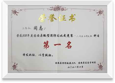 王昌權同志榮獲2021年度固安縣微型消防站比武競賽”一人兩盤水帶連接“科目第一名